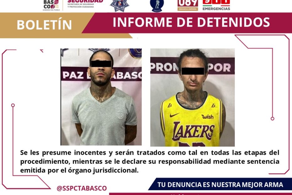 En operativos de vigilancia y prevención, elementos de la Secretaría de Seguridad Pública de Tabasco, a través de la Fuerza Interinstitucional de Reacción Táctica (FIRT) Olmeca, detuvieron a dos hombres por presunto delito contra la Ley General de la Salud.