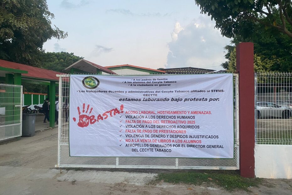 Desde este lunes, integrantes del Sindicato de Trabajadores de la Educación Media Superior (STEMS) del CECyTE Tabasco colocaron lonas de protesta en los 21 planteles del subsistema en el estado, para denunciar violaciones al contrato colectivo de trabajo, así como amenazas, despidos injustificados y falta de pago de prestaciones.