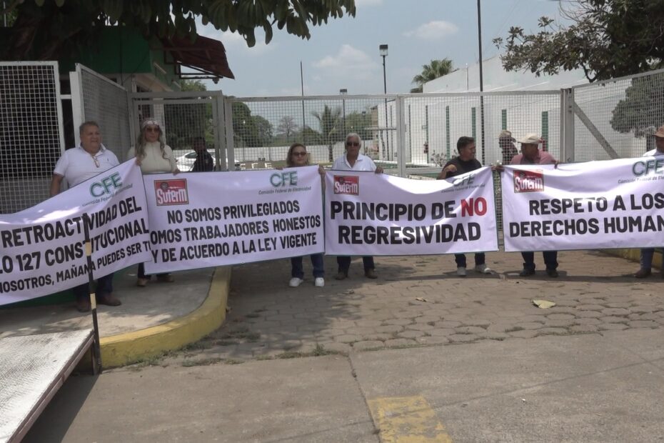 Con pancartas alusivas a la afectación que trajo consigo la reforma al artículo 127 en el rubro de pensiones, decenas de jubilados de confianza y sindicalizados de la Comisión Federal de Electricidad en Tapachula se manifestaron en las instalaciones de la paraestatal para alzar la voz en contra de la incertidumbre jurídica que persigue dicha reforma constitucional.