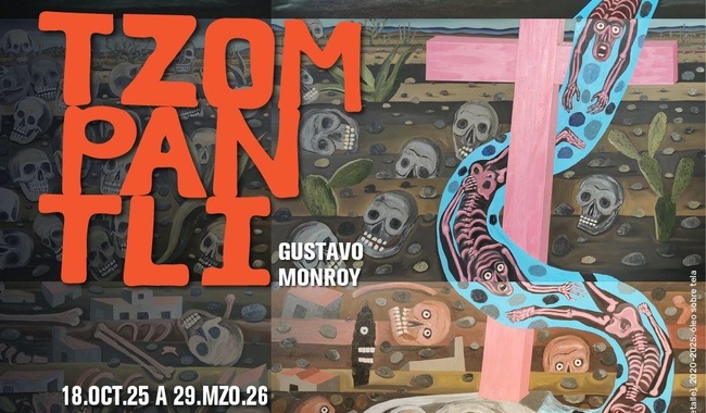 Gustavo Monroy retoma la referencia visual del “Huey Tzompantli”, resaltando la brutalidad y solemnidad de la muerte.