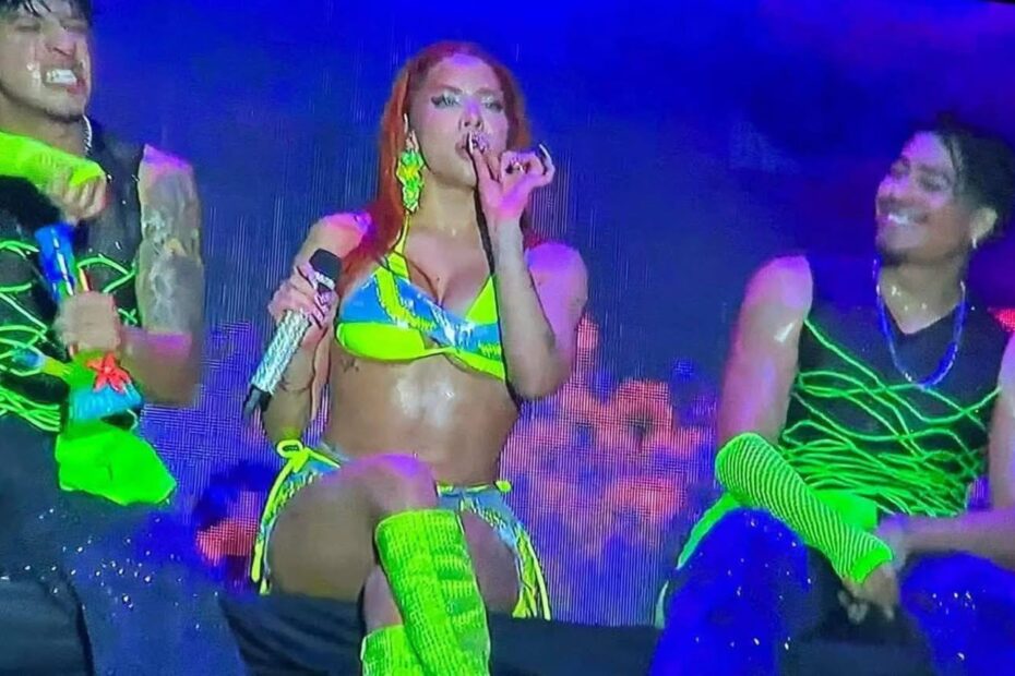 Ante miles de asistentes, la intérprete veracruzana pidió autorización de manera pública para consumir drogas y posteriormente fumó un cigarro con características similares a uno de mariguana. Además, también utilizó lo que aparentaba ser un “bong” o pipa, acompañada por dos de sus bailarines.