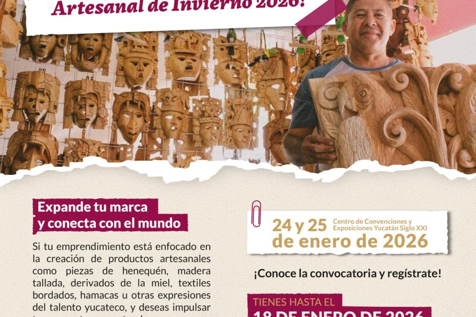 El Instituto Yucateco de Emprendedores (IYEM) lanzó la convocatoria para participar en el Bazar Artesanal de Invierno 2026, que se llevará a cabo los días 24 y 25 de enero en el Centro de Convenciones Yucatán Siglo XXI.