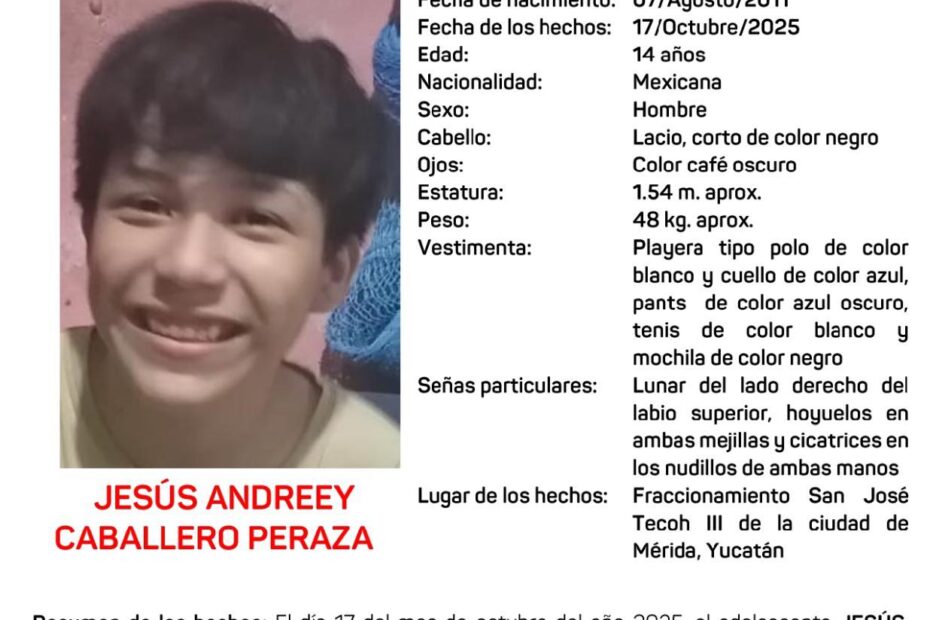 La Fiscalía General del Estado activó la Alerta Amber Yucatán para solicitar el apoyo de la ciudadanía en la ubicación de Jesús Andree y Caballero Peraza, adolescente de 14 años, cuyo paradero se desconoce desde el 17 de octubre de 2025.