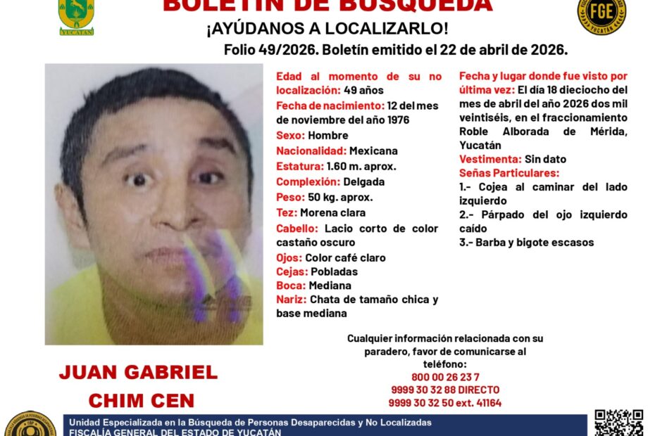 Autoridades estatales emitieron un boletín de búsqueda por la desaparición de Juan Gabriel Chim Cen, de 49 años, quien fue visto por última vez en el fraccionamiento Roble Alborada, en la ciudad de Mérida.