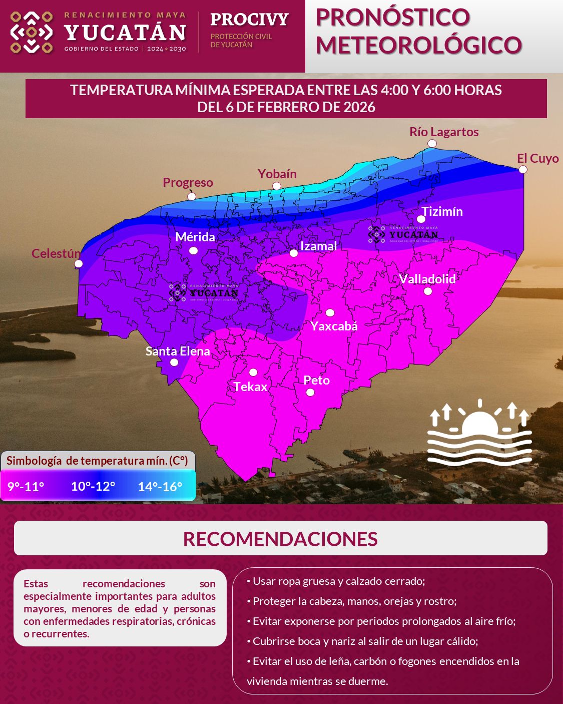 El amanecer de mañana viernes 6 de febrero, será muy frío previendo una temperatura mínima de 9 a 11°C en los municipios de Peto, Tzucacab, Tixmehuac, Dzán, Oxkutzcab y áreas colindantes y, de 10 a 12°C en Mérida, Umán, Kanasín, Izamal, Motul, Homún, Tixcacalcupul, Valladolid, Tizimín y municipios aledaños, mientras que en la costa se esperan registros entre 14 y 16°C.