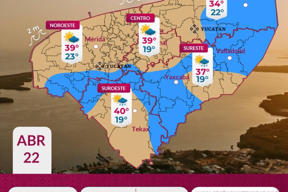 Las temperaturas máximas oscilarán entre los 34 y 39°C en municipios del interior del estado. No obstante, en localidades como Izamal, Chacsinkín, Tixmehuac, Tahdziú, Teabo, Mayapán, Cantamayec, Opichén, Kopomá y Chocholá podrían alcanzarse hasta los 40°C. En la zona costera, los valores se mantendrán entre los 28 y 30°C.
