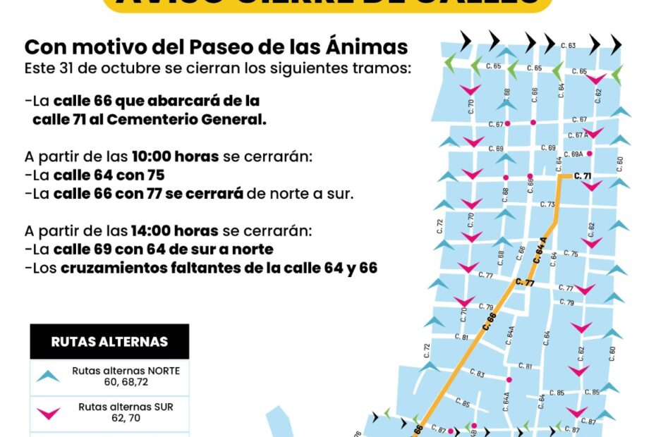 La Policía Municipal de Mérida, en coordinación con la Secretaría de Seguridad Pública (SSP), implementará este viernes 31 de octubre un dispositivo vial que implicará el cierre al tránsito vehicular de la calle 66 desde la 71 hasta el Cementerio General.