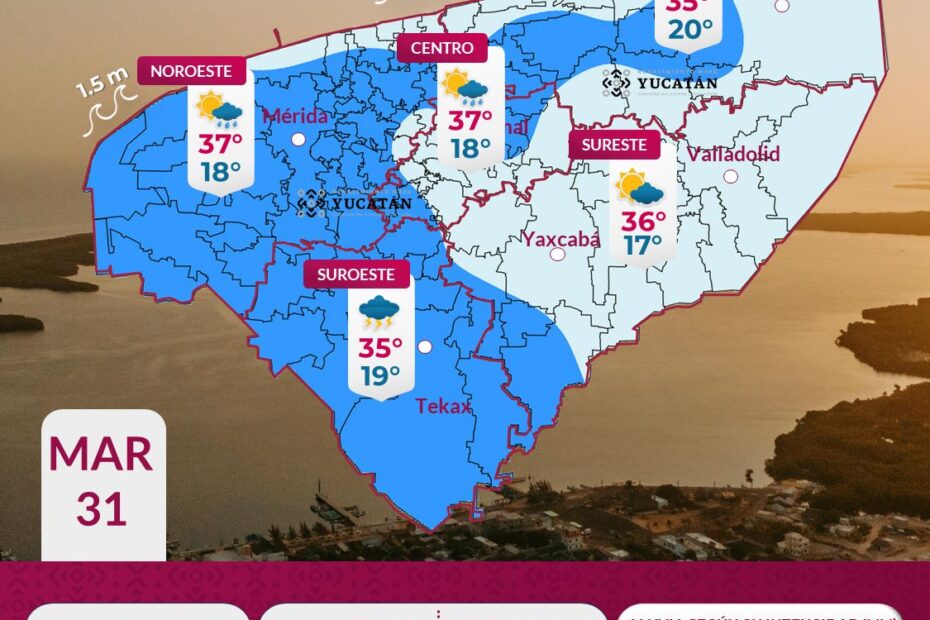 En el litoral yucateco, se prevé oleaje de entre 1 y 1.5 metros de altura. En cuanto al viento, será del este y sureste por la mañana con velocidades de 10 a 20 km/h, cambiando por la tarde al noreste con rachas de hasta 50 km/h en la zona costera.