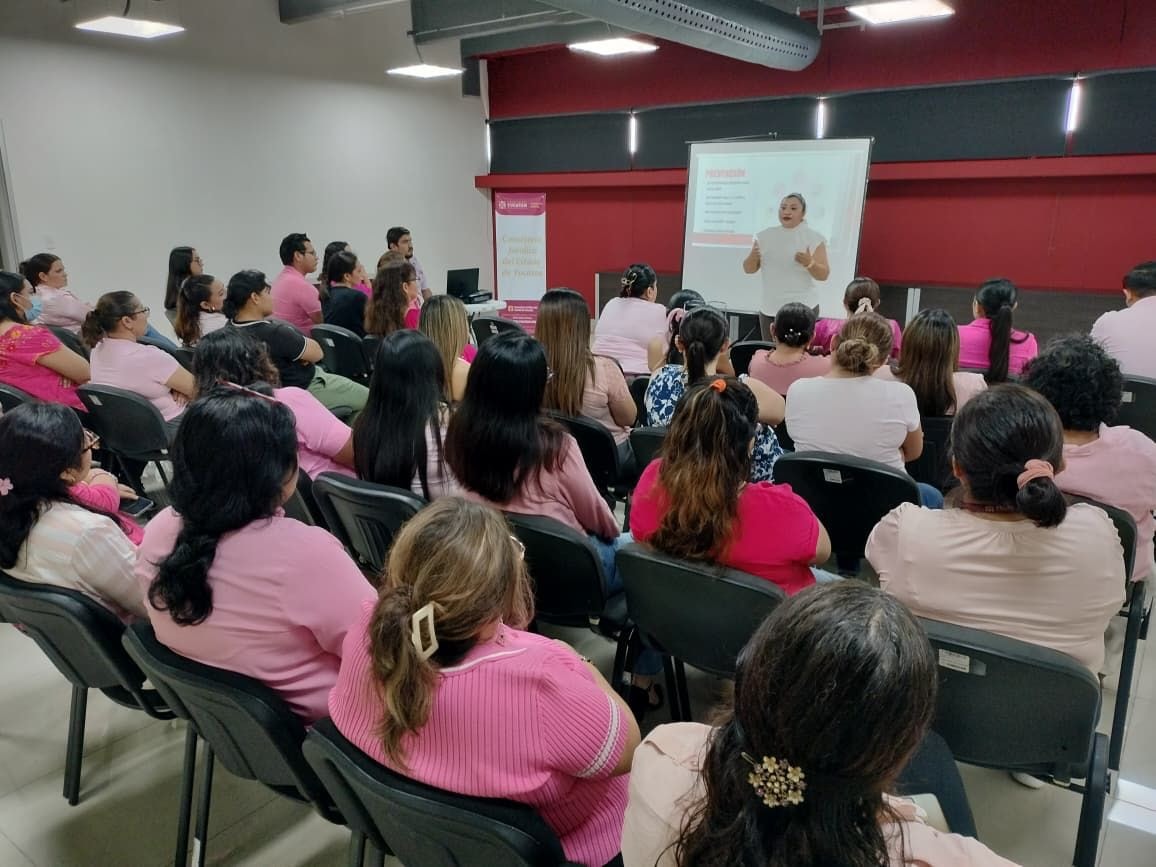 Las actividades incluyeron la plática “Prevención y detección temprana del cáncer de mama”, impartida por Sandra Hidalgo, enfermera de los Servicios de Salud de Yucatán, quien explicó los factores de riesgo, los signos de alerta y la importancia de la autoexploración mensual, además de promover los estudios de mastografía y ultrasonido.