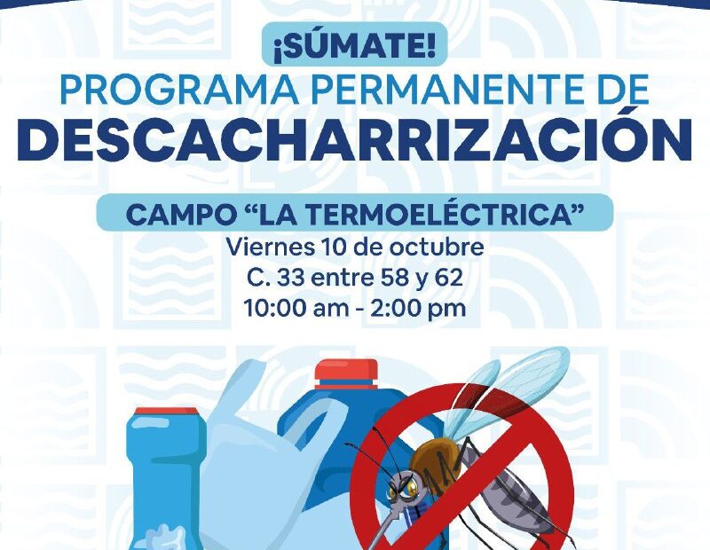 El personal de Prolimpia estará recibiendo cacharros de 10:00 a.m. a 2:00 p.m. en la calle 33 entre 58 y 62, cerca del campo deportivo conocido como “La Termoeléctrica”. Se recibirán botellas, cubetas, latas, envases y todo tipo de objetos inservibles que puedan acumular agua y convertirse en criaderos de mosquitos transmisores de dengue, zika y chikungunya.