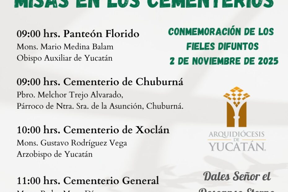“A las 9 de la mañana en el panteón florido, presidirá la Misa Monseñor Mario Medina Balam Obispo auxiliar de Yucatán, también a las 9 de la mañana en el cementerio de Chuburná, el Padre Melchor Trajo Alvarado, Párroco de Nuestra Señora de la Asunción en Chuburná presidirá esta Misa. A las 10 de la mañana el señor Arzobispo, Monseñor Gustavo Rodríguez Vega presidirá la Misa en el cementerio de Xoclán y a las 11 de la mañana en el cementerio general presidirá la Misa, Monseñor Pedro Mena Díaz, Obispo auxiliar de Yucatán”.