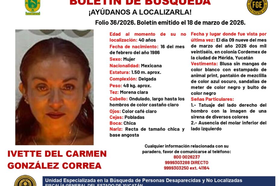 La Fiscalía General del Estado de Yucatán emitió el boletín de búsqueda folio 36/2026 el 18 de marzo de 2026 para localizar a Ivette del Carmen González Correa, de 40 años de edad, quien fue vista por última vez el 9 de marzo de 2026 en la colonia Cordemex, en Mérida; el caso es atendido por la Unidad Especializada en la Búsqueda de Personas Desaparecidas y No Localizadas.