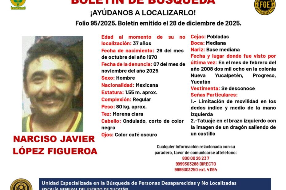 Autoridades estatales solicitaron el apoyo de la ciudadanía para localizar a Narciso Javier López Figueroa, quien cuenta con un boletín de búsqueda activo emitido por la Fiscalía General del Estado de Yucatán.