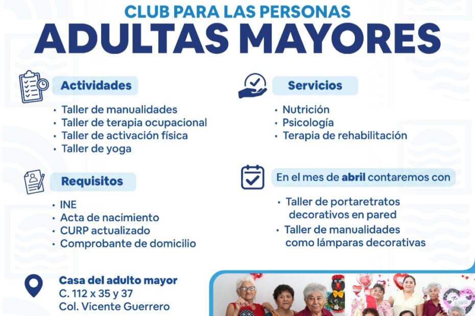 Las actividades se llevarán a cabo en la Casa del Adulto Mayor, ubicada en la calle 112 por 35 y 37, en la colonia Vicente Guerrero, con atención de lunes a viernes.