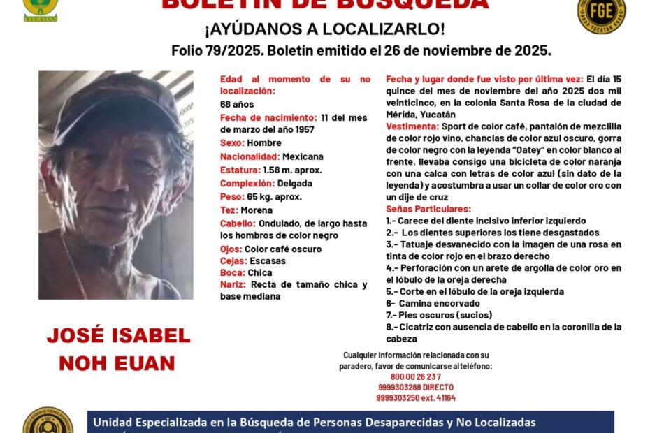 La Fiscalía General del Estado activó una alerta de búsqueda para localizar a José Isabel Noh Euán de 68 años, quien desapareció el pasado 15 de noviembre en la colonia Santa Rosa, en la capital yucateca. Desde entonces, su familia no ha tenido ninguna noticia y teme por su seguridad.