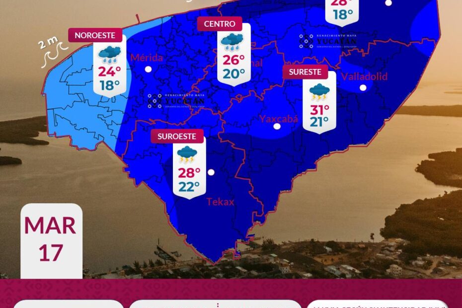 Este martes 17 de marzo continuarán los efectos del Frente Frío No. 41 en Yucatán, generando cielo nublado con lluvias ligeras a moderadas por la mañana y precipitaciones más intensas por la tarde, principalmente en municipios del noreste y sureste.