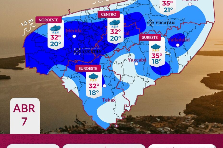 Las temperaturas máximas oscilarán entre los 30 y 32°C en municipios como Izamal, Motul, Mérida, Umán, Kinchil, Sotuta, Ticul y Tekax, mientras que en Valladolid, Chemax y Temozón se prevén valores de entre 33 y 35°C.