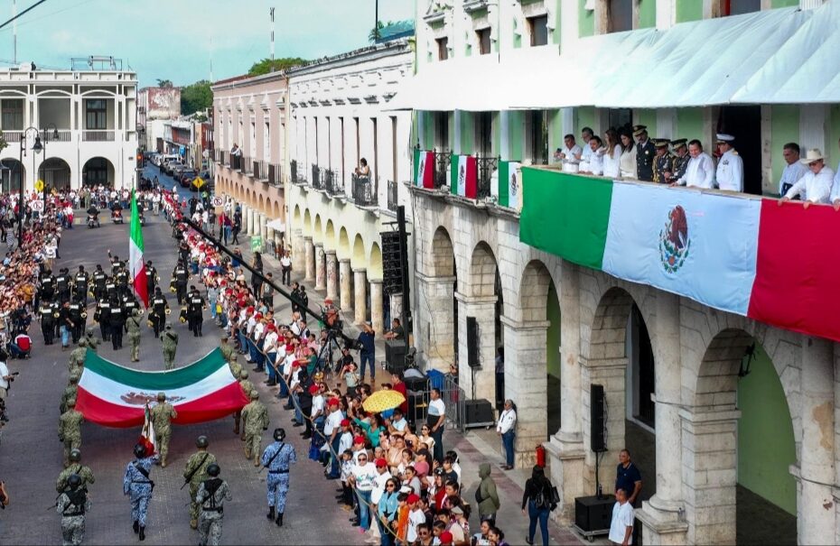 Desde el balcón central de Palacio de Gobierno, el mandatario estatal disfrutó, junto a las familias yucatecas, la muestra de gallardía, marcialidad y disciplina a cargo de efectivos de instituciones de seguridad, así como agrupaciones escolares.