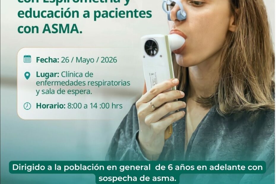 La actividad se llevará a cabo el próximo 26 de mayo en la Clínica de Enfermedades Respiratorias, en un horario de 8:00 de la mañana a 2:00 de la tarde, donde se ofrecerán estudios de espirometría para identificar posibles casos de asma.