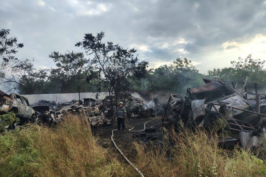 Las llamas avanzaron rápidamente debido al material seco en la zona y alcanzaron un encierro de vehículos chatarra ubicado a un costado de la vía.