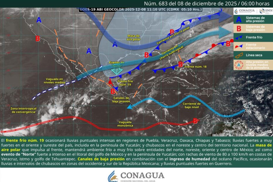 “El día de hoy lunes ya llegó a la costa los primeros efectos del frente frío número 19 que tiene una masa de aire frío que lo acompaña, es de intensidad moderada por lo que provocará norte moderado en la costa con vientos de hasta 55 kilómetros por hora se espera que provoque lluvias a partir de este momento en diferentes zonas, primero en el norte luego centro y luego sur del estado ya por la tarde”.