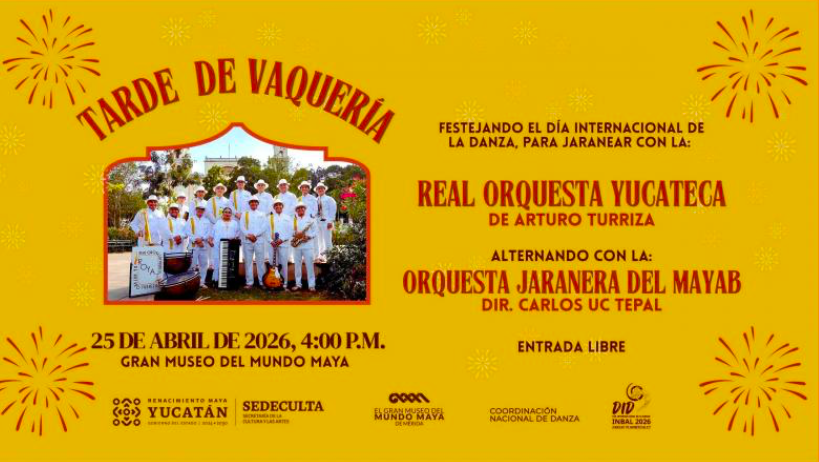 La música y el baile tradicional de Yucatán llegarán al Gran Museo del Mundo Maya con la Tarde de Vaquería, en una actividad sin precedentes que la Secretaría de la Cultura y las Artes (Sedeculta) organiza este 25 de abril para celebrar el Día Internacional de la Danza, con acceso gratuito para todo público.