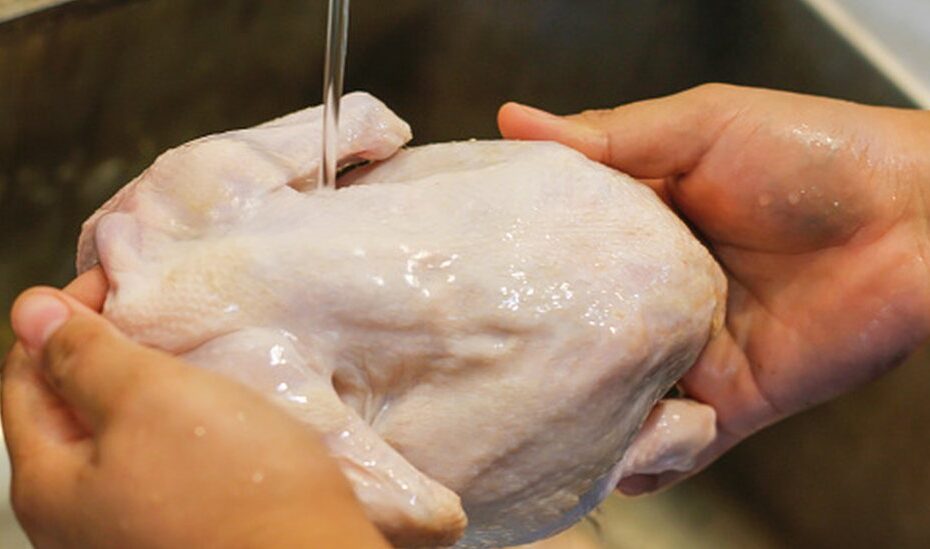 ¿Qué le pasa al pollo? Empecemos por lo más básico: al pollo no le pasa nada. El riesgo vinculado con ‘lavar el pollo’ no tiene que ver con el pollo en sí. Tiene que ver con la contaminación cruzada: con que las bacterias del pollo crudo (que serían eliminadas durante la preparación) pasan a manos, fregadero, encimeras y utensilios varios.
