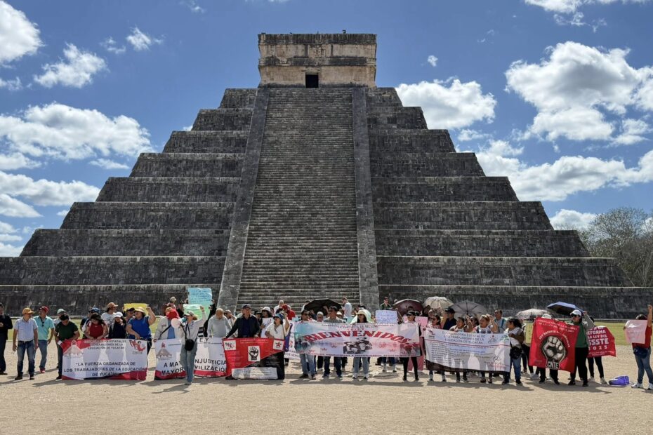 Entre consignas y pancartas, integrantes de la Coordinadora Estatal de Trabajadores de la Educación de Yucatán realizaron una protesta este viernes en la zona arqueológica de Chichén Itzá, como parte del cierre del paro nacional de 72 horas.