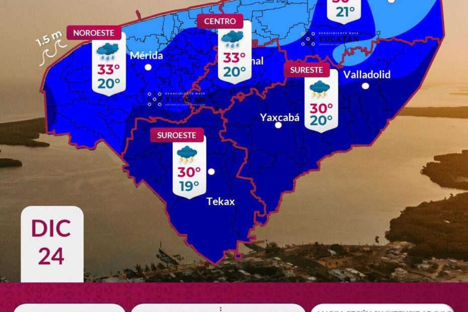 Para este miércoles 24 de diciembre, el ingreso de humedad procedente del Mar Caribe continuará favoreciendo la presencia de lluvias en diversas regiones del estado de Yucatán, informó Protección Civil.