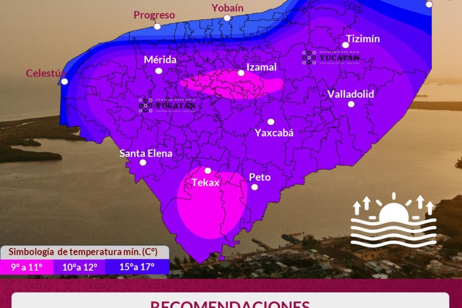 En municipios del centro, noreste y noroeste —incluida Mérida— las mínimas serán de 10 a 12°C, mientras que en la zona costera oscilarán entre 15 y 17°C.