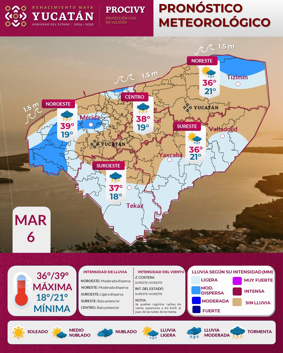 Para este viernes 6 de marzo, el ingreso de humedad y el establecimiento de una vaguada sobre la península de Yucatán, favorecerán en Yucatán ambiente fresco por la mañana con temperaturas mínimas de 18° a 21°C y muy caluroso por la tarde, alcanzando temperatura máxima de 37 a 39 °C en municipios del centro y noroeste del estado, de 34 a 37°C en el noreste, sureste y suroeste y de 28 a 30 °C en la zona costera.