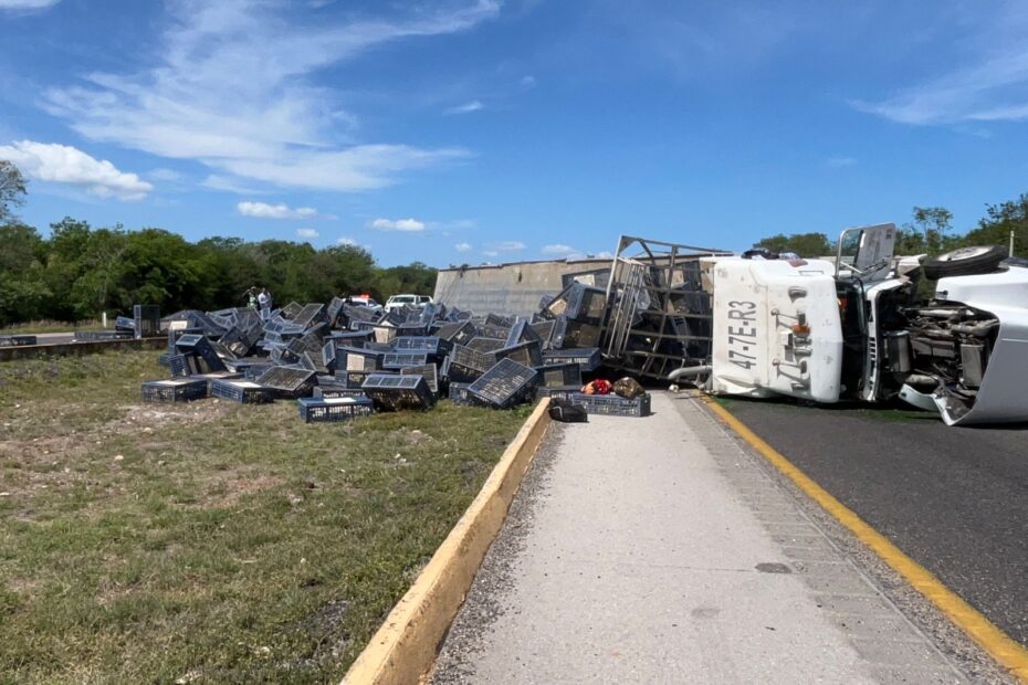 Un tractocamión que transportaba gallinas volcó en el kilómetro 145 de la carretera Mérida-Campeche, a la altura de Umán, Yucatán, el 14 de abril, sin que se reportaran personas lesionadas de gravedad.