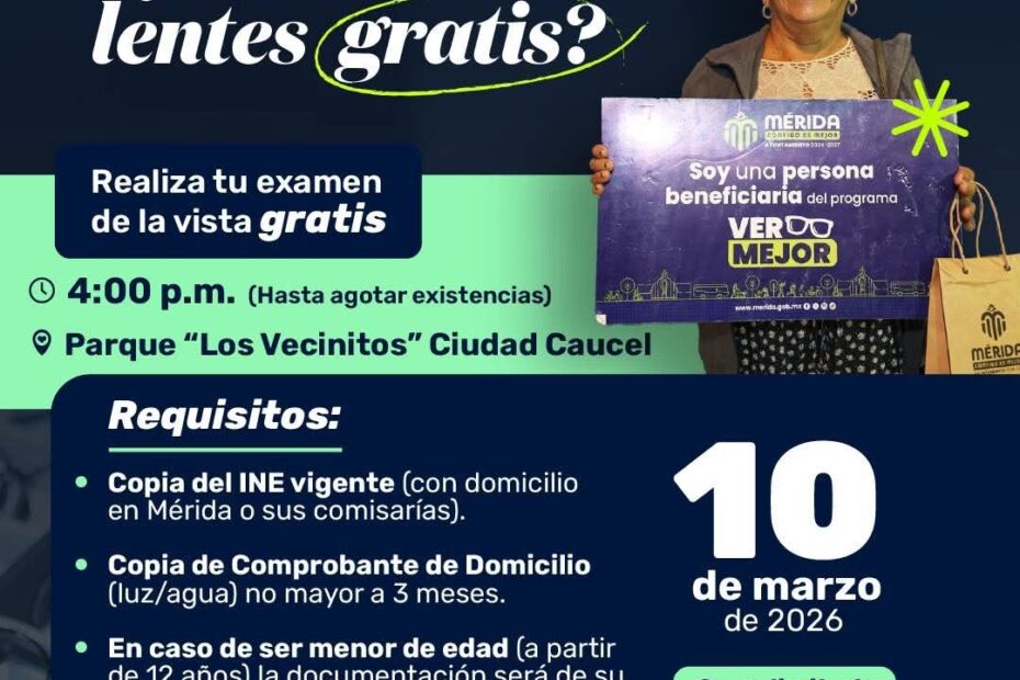 El ayuntamiento de Mérida, a través de la Dirección de Desarrollo Social y Combate a la Pobreza abre una convocatoria donde los ciudadanos puedan adquirir lentes completamente gratis con la campaña “Ver Mejor” que en esta ocasión llegará a Ciudad Caucel, específicamente en el parque “los Vecinitos”.