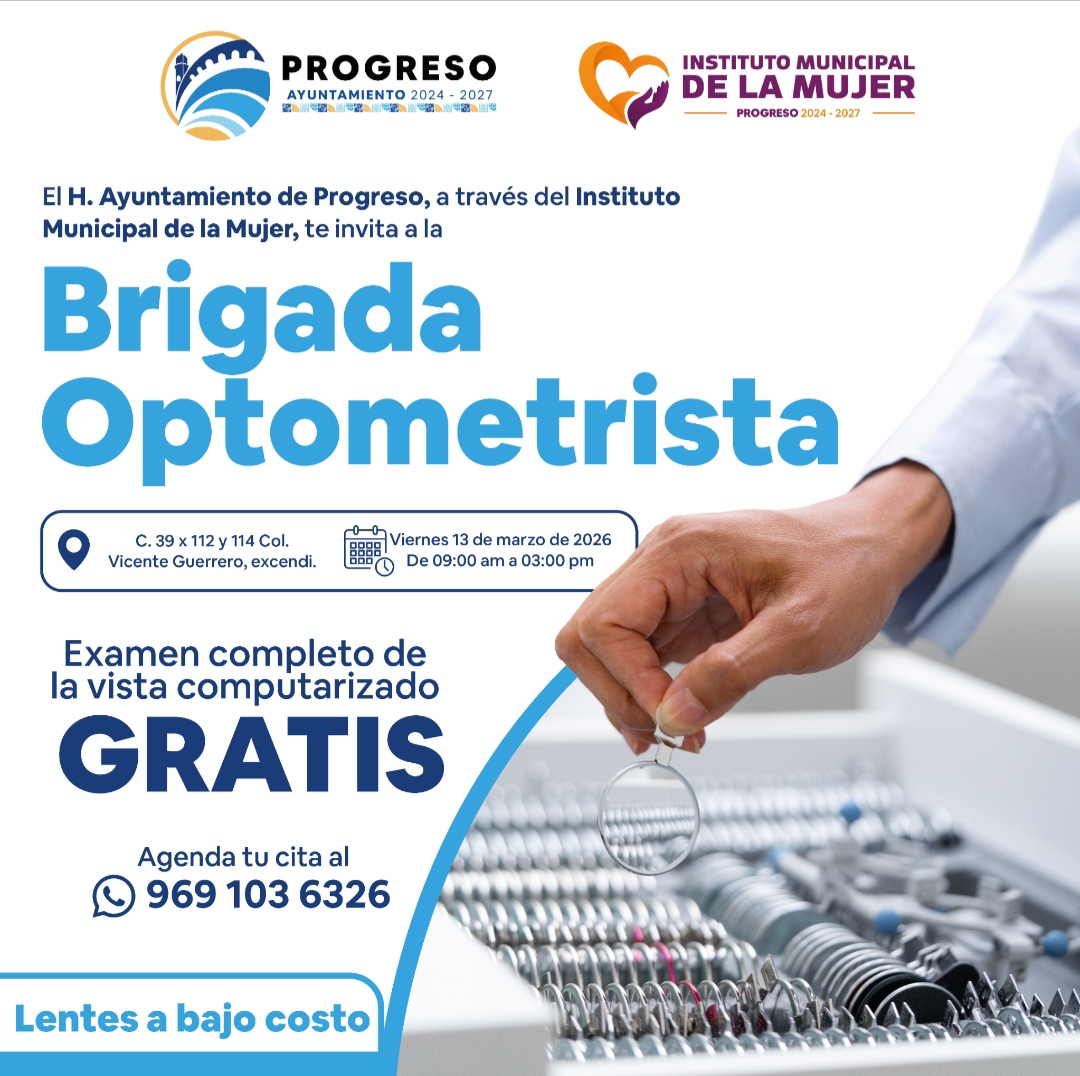 El H. Ayuntamiento de Progreso, encabezado por el presidente municipal Erik Rihani González, a través del Instituto Municipal de la Mujer, invita a la ciudadanía a participar en la Brigada Optometrista, una jornada de salud visual cuyo objetivo es acercar servicios especializados a la población y fortalecer la prevención en materia de salud.