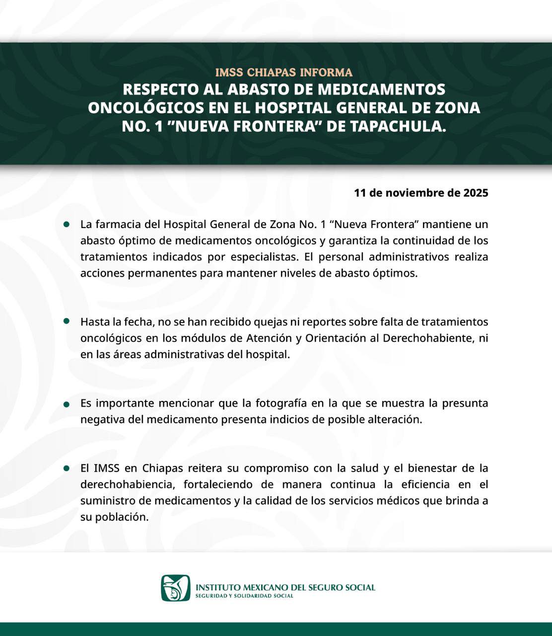 Hasta la fecha, no se han recibido quejas ni reportes sombre falta de tratamientos oncológicos en los módulos de Atención y Orientación al Derechohabiente, ni en las áreas administrativas del hospital.