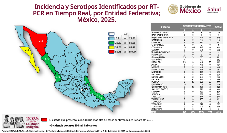 Dentro de la jerarquía nacional, los estados con mayor número de casos y muertes se concentran fuera de la región peninsular. Entidades como Sonora, Veracruz, Jalisco, Sinaloa y Guanajuato agrupan la mayor carga de enfermedad y letalidad, manteniendo a la Península de Yucatán en un nivel medio-bajo tanto en incidencia como en mortalidad, de acuerdo con la tasa por cada 100 mil habitantes.