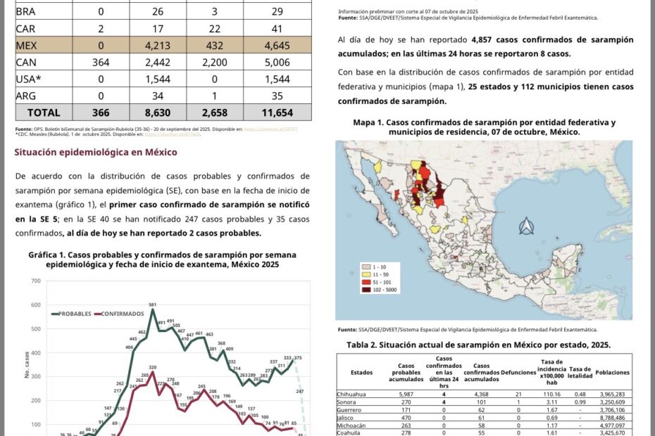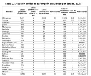 En los últimos 2 días, los pacientes confirmados de sarampión sumaron 40, notificados en Chihuahua, Jalisco, Coahuila, Colima y Querétaro.