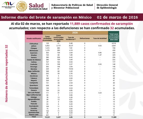 Del 1 de enero de 2025 a la fecha se han notificado 30,951 casos probables de sarampión, de los cuales 11,889 han sido confirmados.