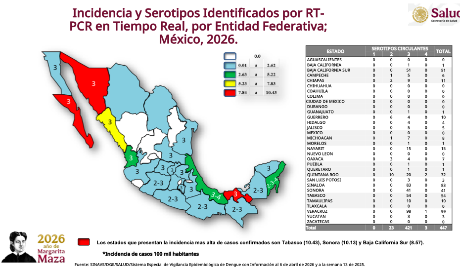 A nivel regional, el comportamiento no ha sido el mismo. Estados como Quintana Roo acumulan 57 casos confirmados de dengue, mientras que Campeche registra ocho, cifras que evidencian la presencia activa de la enfermedad en la Península.
