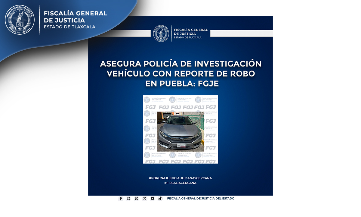 Elementos de la Policía de Investigación de la Fiscalía General de Justicia del Estado (FGJE) aseguraron un vehículo marca Honda, tipo Sedán, modelo 2017, color plata, que contaba con reporte de robo en el estado de Puebla.