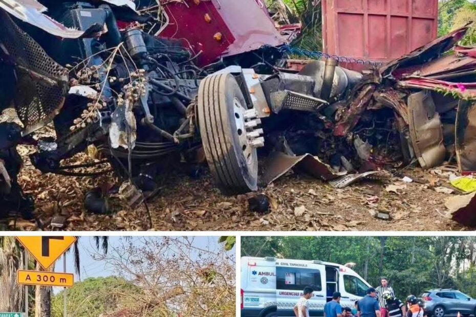 Se registró un fuerte accidente vehicular sobre la carretera Tapachula–Puerto Madero, a la altura de la Base Aeronaval, a unos 200 metros del aeropuerto, donde un tráiler y al menos una camioneta se vieron involucrados.