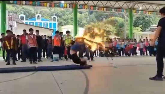 En Francisco León, Chiapas, el desfile del 20 de Noviembre estuvo a punto de terminar en tragedia cuando un grupo de jóvenes realizó acrobacias sobre un aro de fuego y uno de ellos casi cayó entre las llamas.
