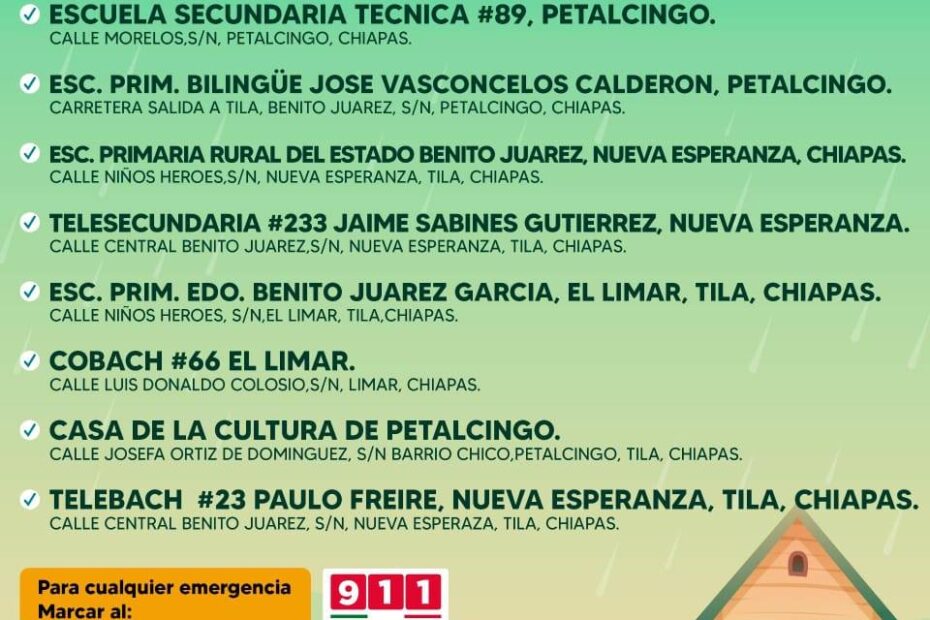 Derivado de las fuertes lluvias en la región se han activado diversos refugios temporales en el municipio de Tila, con la finalidad de salvaguardar la integridad de los ciudadanos que se encuentran en riesgo, toda vez que sus domicilios están ubicados cerca de ríos que ya han presentado desbordamientos por las fuertes lluvias que trae consigo el Frente Frio No. 13