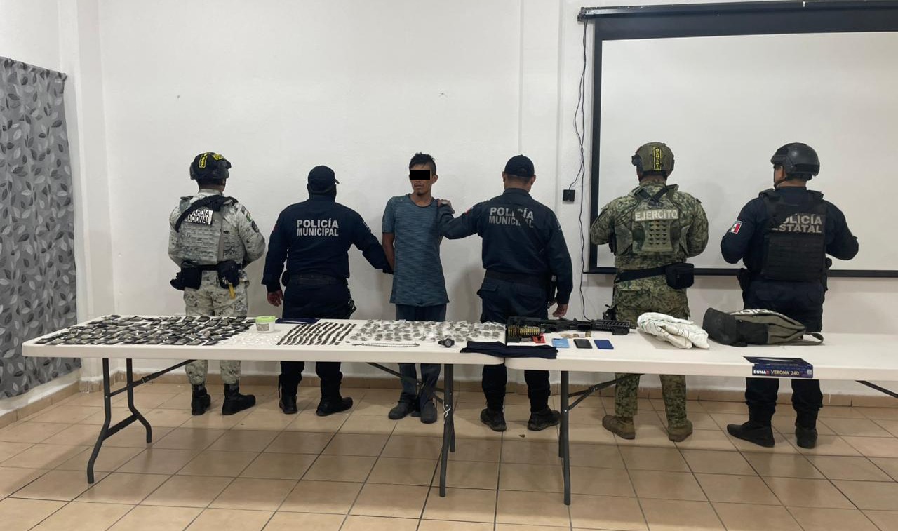 Durante el interrogatorio, el individuo proporcionó información sobre la ubicación de un armamento, lo que permitió a las fuerzas del orden desplegar un operativo adicional en la ranchería La Cruz, donde se aseguraron armas de fuego y diversas dosis de droga.