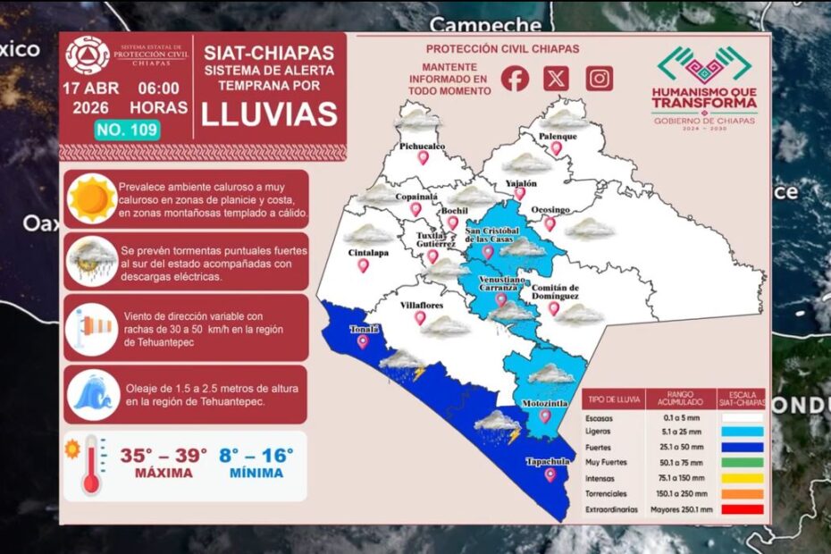 Se esperan lluvias fuertes para las regiones Soconusco e Istmo-Costa. De igual manera podrían presentarse lluvias ligeras para las regiones Sierra Mariscal, Llanos y Altos Tsotsil Tseltal.