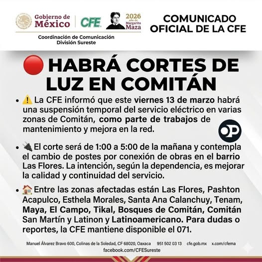 La Comisión Federal de Electricidad (CFE) informó que este viernes 13 de marzo se llevará a cabo una interrupción temporal del suministro eléctrico en diversas colonias y barrios del municipio, como parte de los trabajos de mantenimiento y mejora de la red.