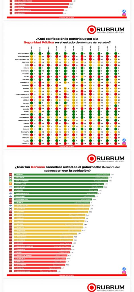 Chiapas vuelve a colocarse en la parte alta del ranking nacional en materia de seguridad pública, de acuerdo con la más reciente evaluación de gobernadores elaborada por la casa encuestadora Rubrum correspondiente a noviembre de 2025.
