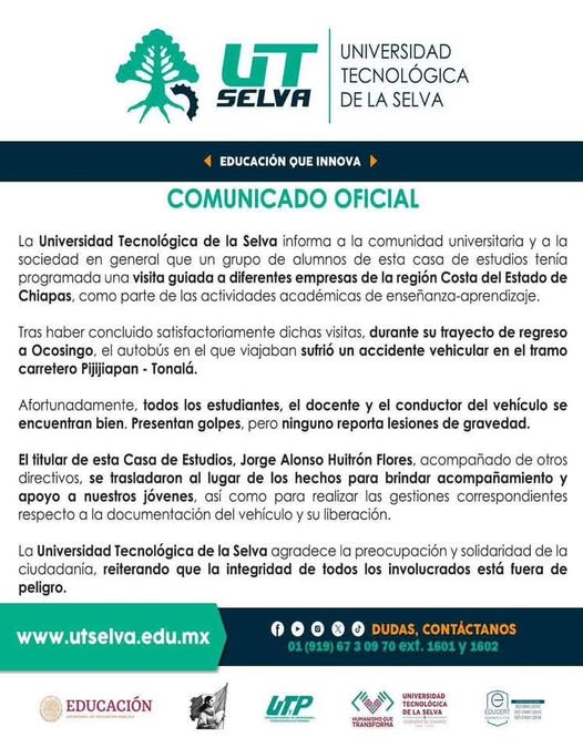 Los hechos se registraron sobre la carretera Tonalá – Pijijiapan , a la altura del ejido El Roble, cuando un autobús que transportaba estudiantes y personal de la universidad de la Selva choco de frente contra un tráiler.