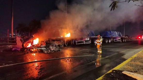 Chofer se duerme y termina incendiando su camión doble remolque en el libramiento