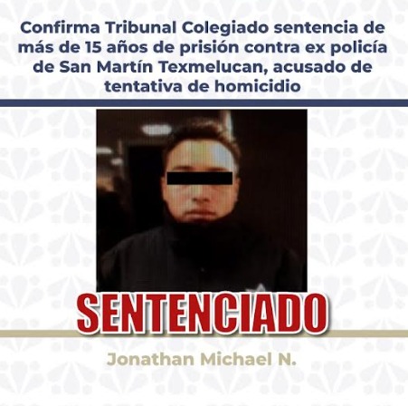 La Fiscalía General del Estado de Puebla informa que el Tribunal Colegiado confirmó la sentencia de 15 años 10 meses de prisión, dictada en contra de Jonathan Michel N., acusado de homicidio calificado en grado de tentativa en el municipio de San Martín Texmelucan, Puebla.